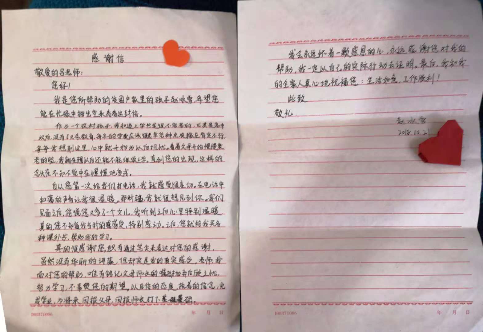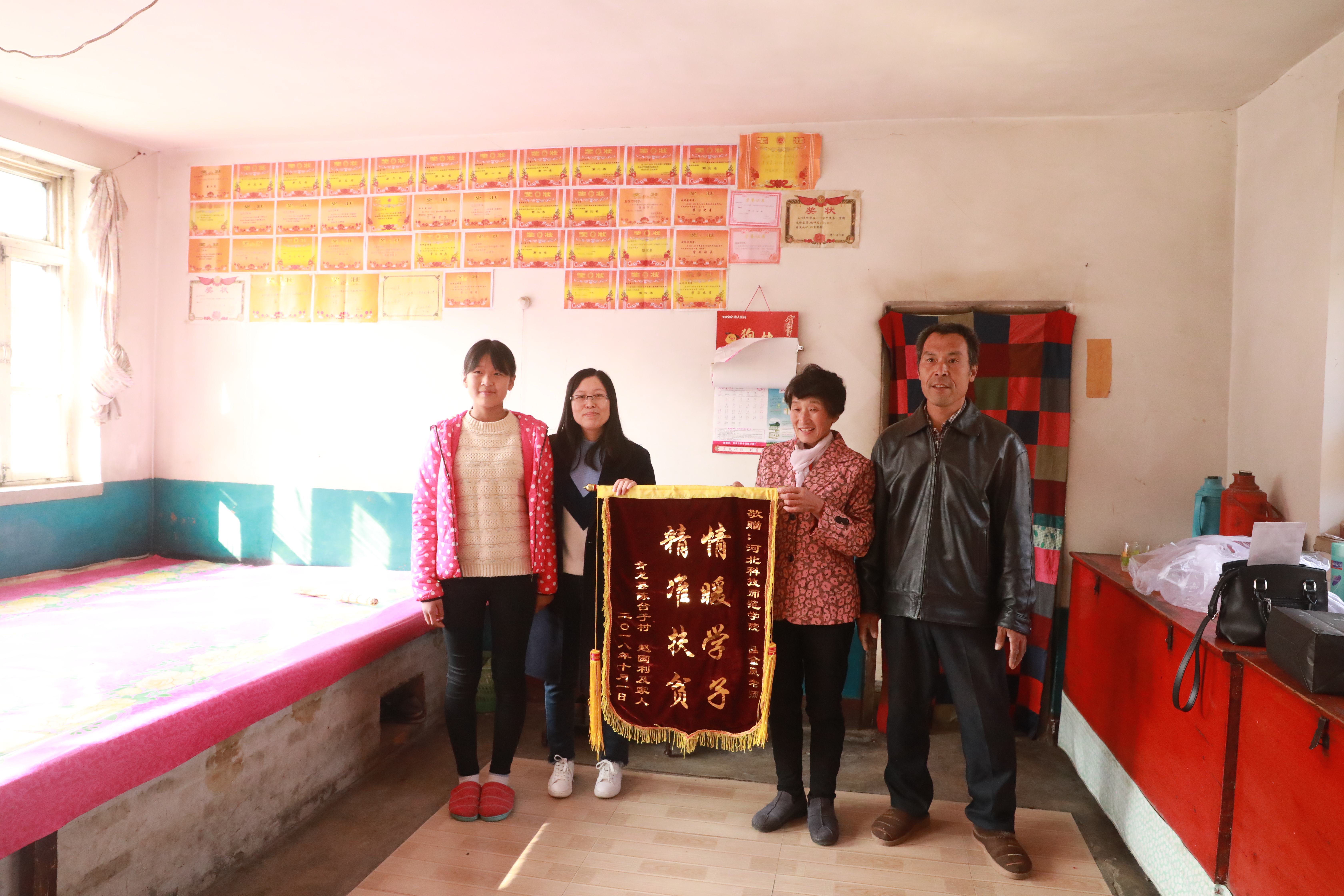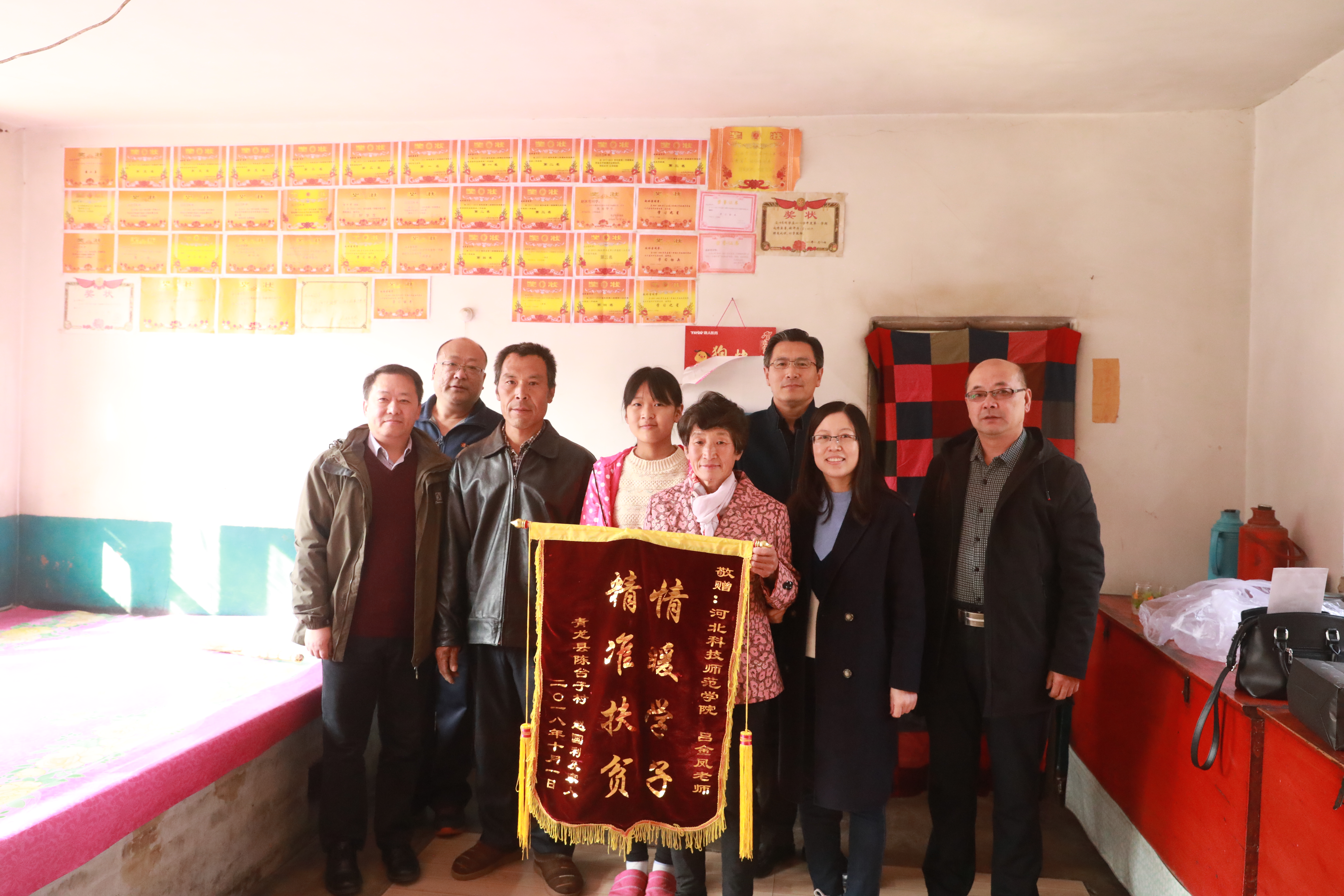 2018年11月3日,青龙陈台子村贫困户赵国利一家人,向我院结对帮扶责任人吕金凤老师赠送一面写有“情暖学子 精准扶贫”的锦旗。他们正在上初中的女儿赵冰雪给吕金凤老师写了一封情真意切的感谢信,一家人真心表达对吕金凤老师三年来对他们真情暖心扶贫助学的感激之情。我校驻陈台子村工作组组长、第一支部书记王伟,必赢官网领导参加了赠送锦旗仪式。