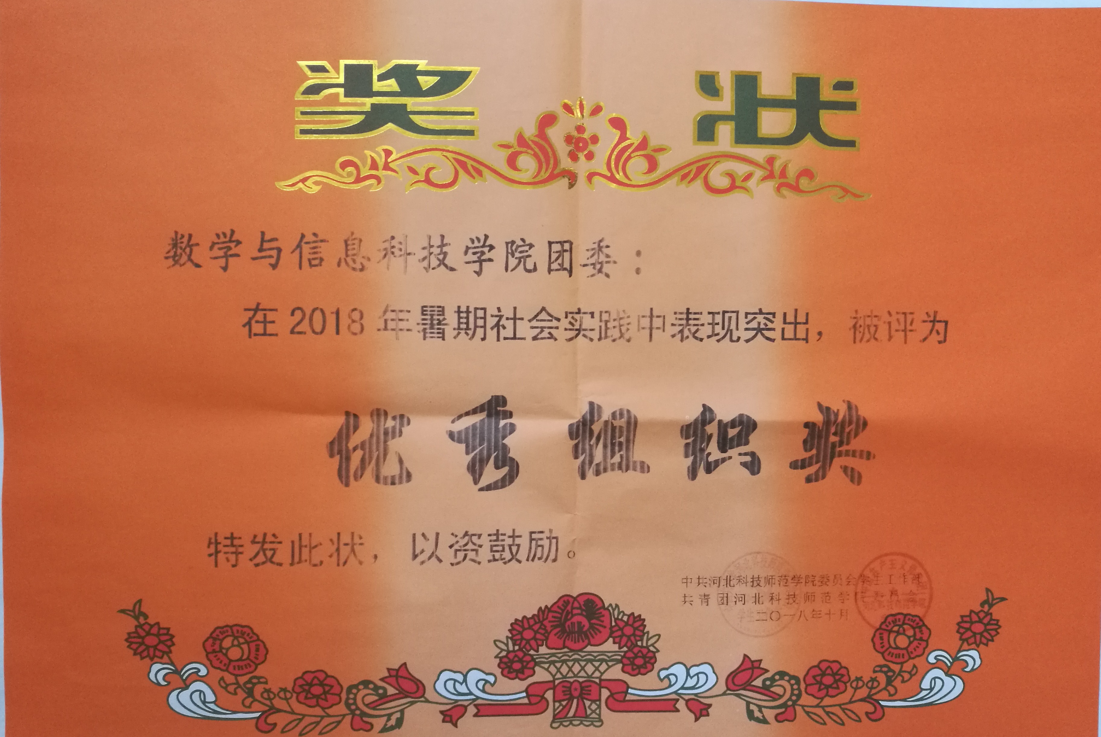 在2018年学校开展的“青春大学习•奋斗新时代”为主题的暑期社会实践活动中,必赢线路检测3003团委表现突出,被学校授予社会实践“优秀组织奖”荣誉称号;授予“烛光连心”实践团、“树信科扶”社会实践团“优秀实践团队”荣誉称号;授予李惠超、焦洪磊“优秀指导教师”荣誉称号;授予王伟、李月荣“社会实践先进个人”荣誉称号。秦皇岛日报、秦皇岛电视台、河北政协新闻网、河北德育网、河北新闻网等多家官方媒体先后对必赢线路检测3003社会实践团的先进事迹给予了宣传报道,为我院赢得了良好的社会声誉,树立了品牌形象!