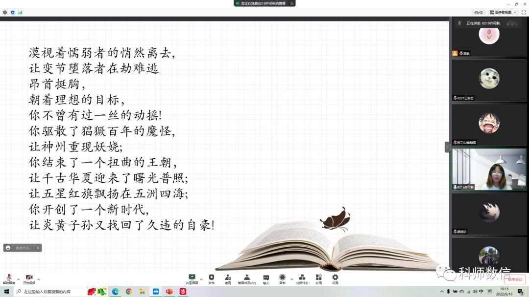 第一环节选手开启摄像头进行形象展示和自我介绍,流畅的普通话不仅彰显了个人风采,也让选手们相互有了认识,迅速活跃了比赛氛围。第二环节参加朗诵、演讲和书法比赛的同学分别进行个人朗诵、个人演讲及作品展示,参赛的同学很多,优秀的作品层出不穷,令人眼花缭乱,充分新颖的PPT及背景音乐准备,也让我们眼前一亮,为完美作品的呈现锦上添花。优美的普通话声声入耳,同学们对学好普通话也有了更深的理解。