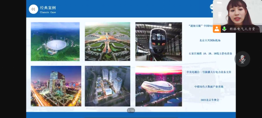 本次招聘会首先由集团人力资源部向线上的同学们放映了石家庄科林电气股份有限公司的宣传片。石家庄科林电气股份有限公司成立于2000年,经过十余年的持续健康发展,科林已经成为电力行业的优秀设备供应商和服务商,是为电力行业、公共事业及大型行业客户提供电力系统一、二次完整解决方案、优质产品和服务的高新技术企业。2021年4月,被河北省委、河北省人民政府表彰为“河北省脱贫攻坚先进集体”。