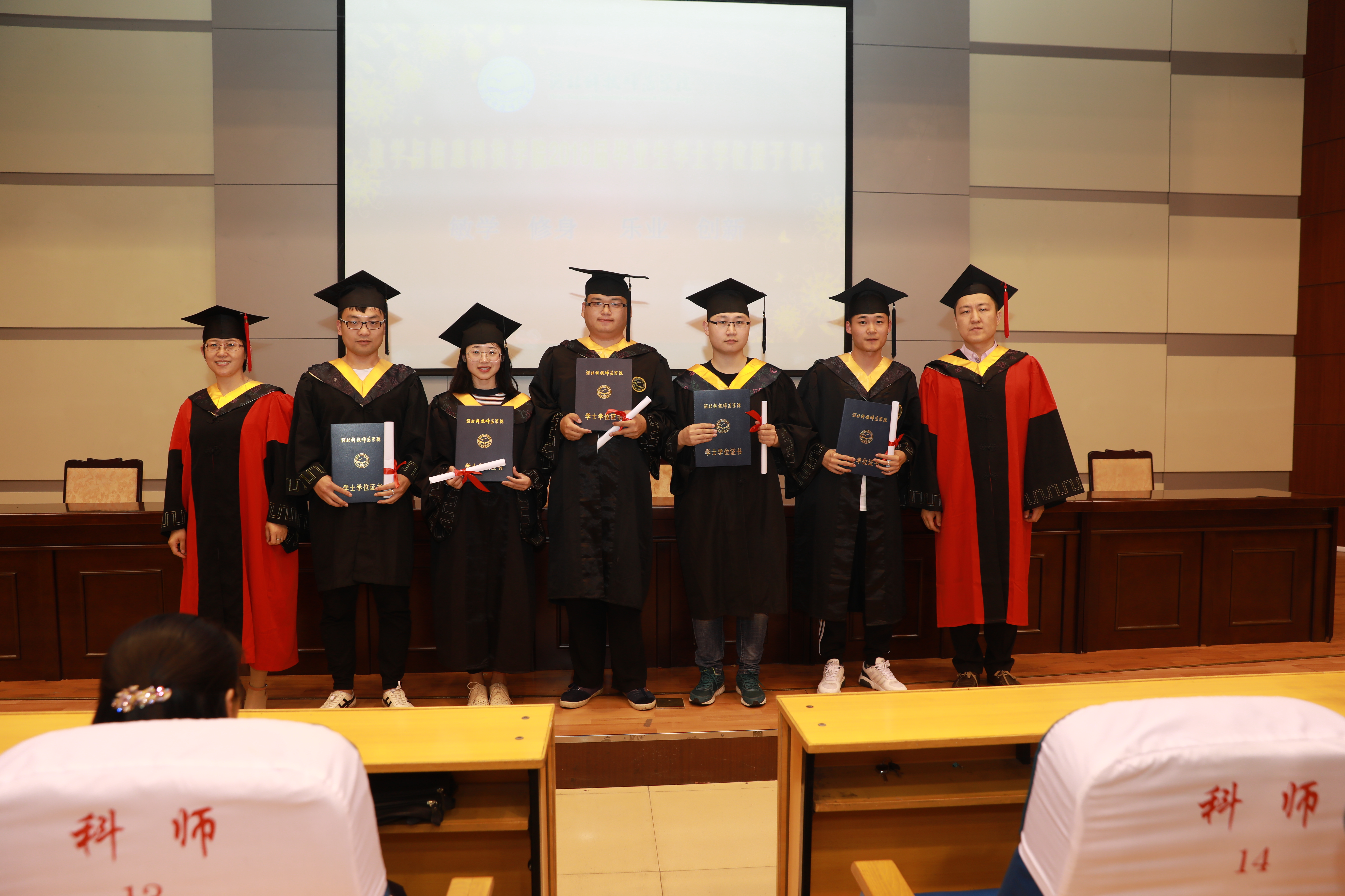 此次授予仪式在庄严的《国歌》和亲切的校歌《科技师院人之歌》声中拉开帷幕。学院行政负责人致辞,代表学院对毕业生们顺利毕业表示祝贺,并提出了期望。随后,毕业生代表发言,表达了学生即将毕业的激动心情和对学校的感恩情怀,表示一定铭记校训,将科师精神发扬光大。最后,2018届毕业生们将学士服、学士帽穿戴整齐,依次有序地走上主席台接受学院专业带头人和教学部主任拨流苏及颁发的学士学位证书,并合影留念。