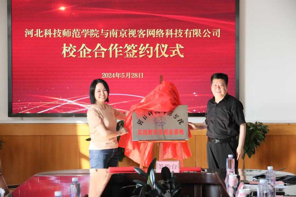 校党委常委、副校长冯瑞银与南京视客网络科技有限公司副总经理缪继红共同签署了校企合作协议,并举行了实践教学与就业基地揭牌仪式。