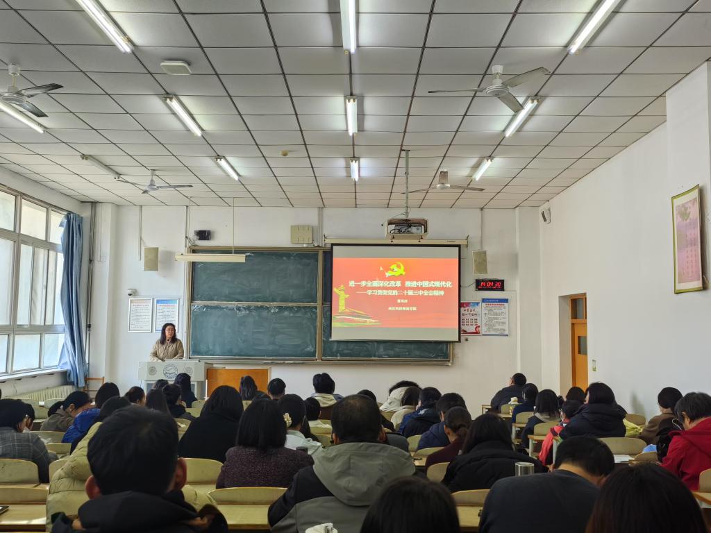 2024年11月21日,必赢线路检测3003党委邀请学校思想政治理论教育宣讲团成员、马克思主义学院曹凤珍博士为师生作党的二十届三中全会精神专题宣讲报告。宣讲会由学院党委书记杨崇泽主持。