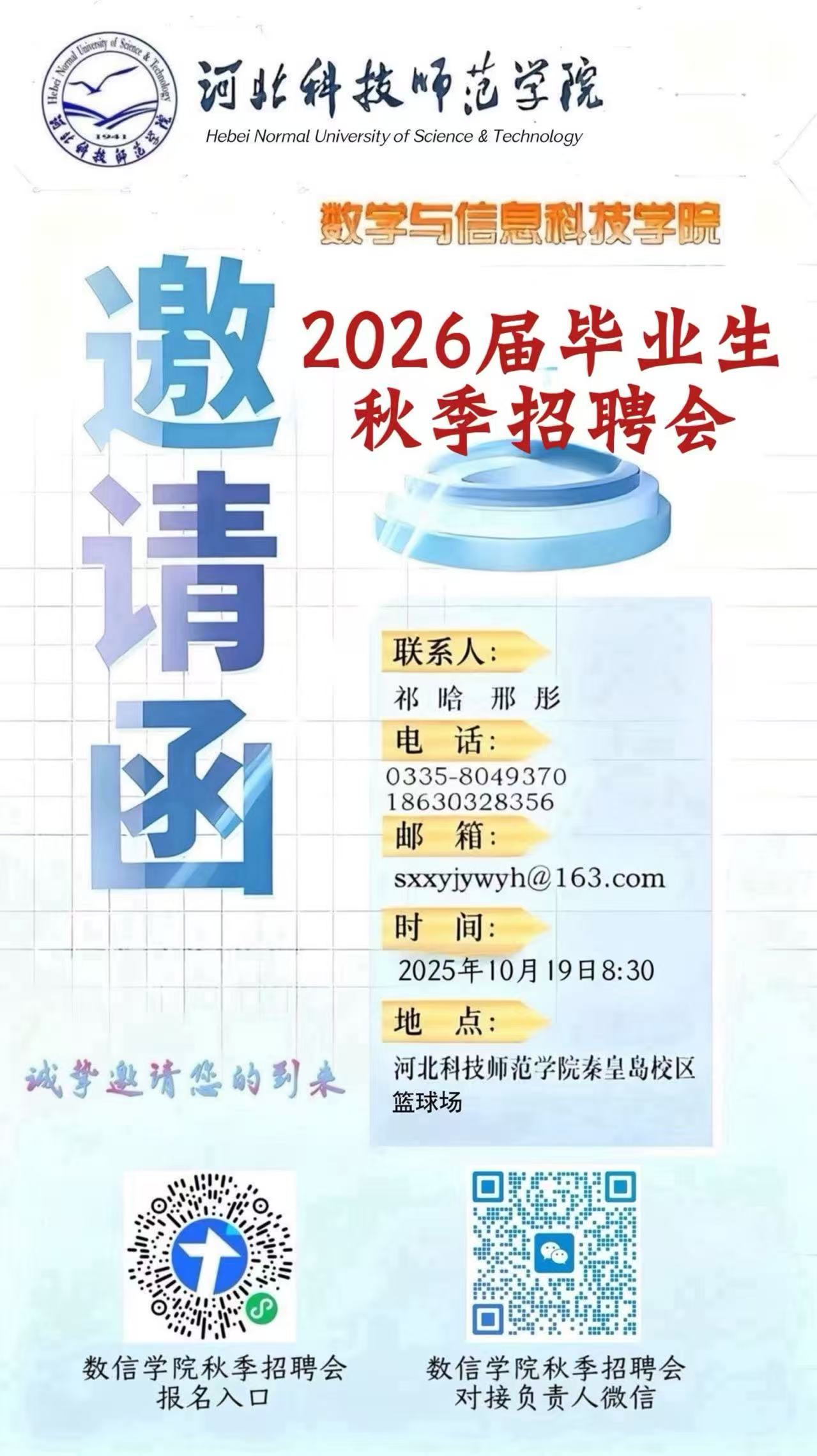 必赢线路检测3003no12026届毕业生秋季校园招聘会10月19日(周日)上午8点在秦皇岛校区篮球场举办。必赢官网向各领域企业发出诚挚邀约---学院2026届毕业生677人,其中研究生29人,本科生648人,涵盖数学与应用数学、计算机科学与技术、网络工程、人工智能、数据科学与大数据技术、物联网工程、应用统计学、数字媒体技术等专业,学生不仅具备扎实的理论功底,同时积累了丰富实践经验。诚挚邀请用人单位来我院选聘人才,扫码即可报名!