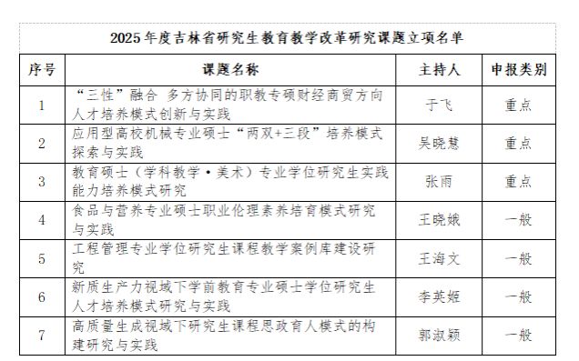 根据《关于开展2025年度吉林省研究生教育教学改革研究课题申报工作的通知》要求,经个人申报、部门推荐、学校初审把关、专家评审打分,按省教育厅限额推荐要求,beat365官网推荐申报课题10项。经省教育厅组织专家评审,beat365官网获立7项研究生教育教学改革研究课题,其中重点课题3项、一般课题4项。具体立项名单详见下表。