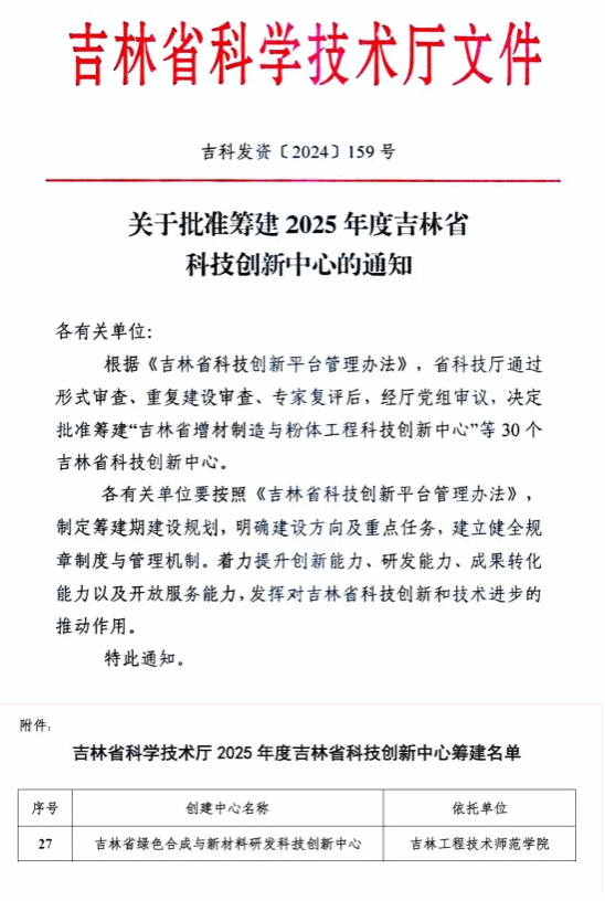 近日,吉林省科技厅印发《关于批准筹建2025年度吉林省科技创新中心的通知》,批准beat365官网化学与工业生物工程交叉学科研究院申报的“吉林省绿色合成与新材料研发科技创新中心”作为筹建项目。此次获批是学校在省级科技创新平台建设方面取得的又一重要成果。截止目前,beat365官网科研平台数目已突破30个,在科研平台建设方面取得了新的突破。对于推动区域科技创新、重大关键核心技术研发与应用,促进科技成果转化,服务重点支柱产业,将起到重要的支撑作用。学校将按照《吉林省科技创新平台管理办法》,做好筹建期建设规划,明确建设方向及重点任务,建立健全规章制度与管理机制,着力提升中心的创新能力、研发能力、成果转化能力以及开放服务能力,为推动吉林省科技创新和技术进步作出应有贡献。