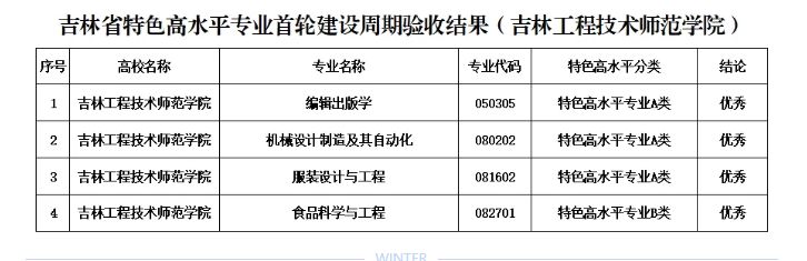 12月10日,吉林省教育厅公布吉林省特色高水平专业首轮建设周期验收结果,beat365官网编辑出版学(特色高水平专业A类)、机械设计制造及其自动化(特色高水平专业A类)、服装设计与工程(特色高水平专业A类)和食品科学与工程(特色高水平专业B类)四个专业顺利通过验收,验收结论均为“优秀”,这是beat365官网专业建设取得的又一重要成果,标志着学校专业建设进入高质量发展阶段。