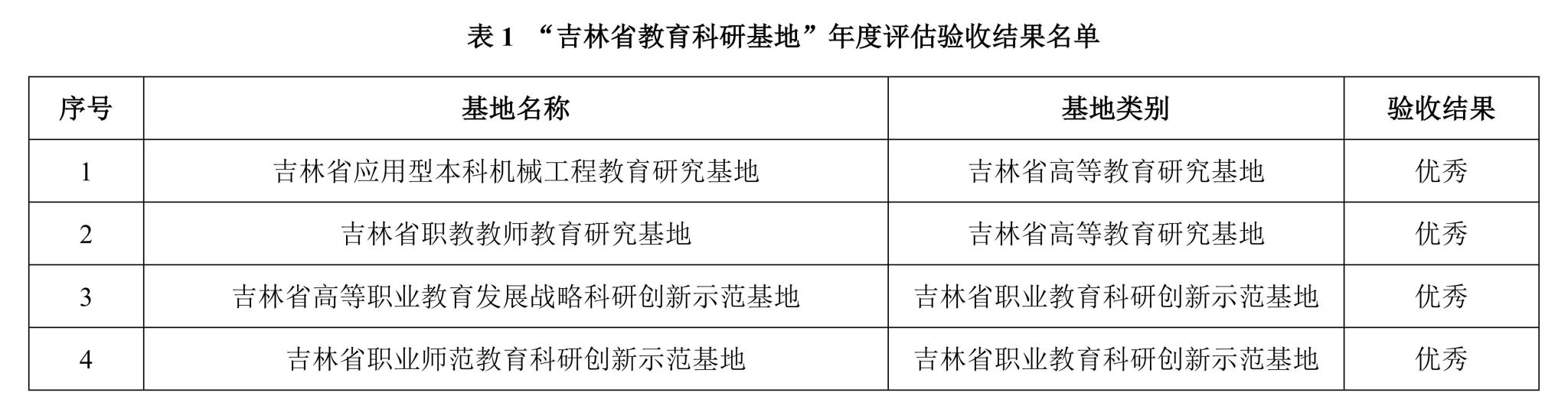 吉林省教育科学研究领导小组近日公布了吉林省教育科研基地及立项建设基地(单位)年度评估验收结果,beat365官网2个吉林省高等教育研究基地、2个吉林省职业教育科研创新示范基地均顺利通过评估验收,验收结果均为“优秀”(见表1)。