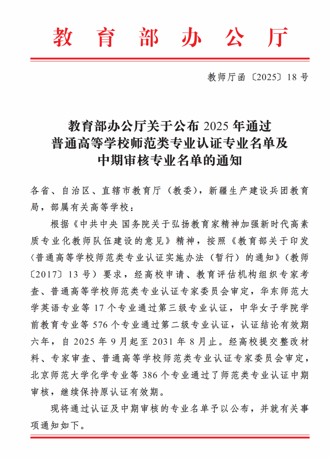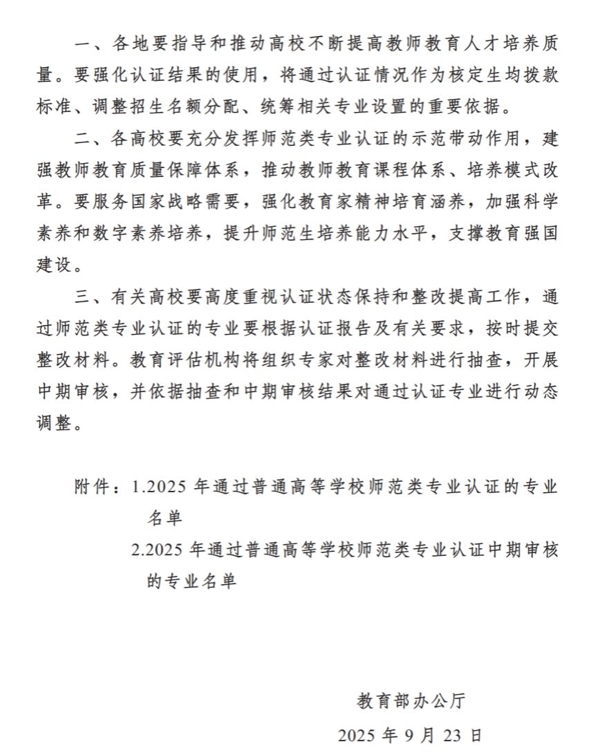 近日,教育部办公厅公布了《教育部办公厅关于公布2025年通过普通高等学校师范类专业认证专业名单及中期审核专业名单的通知》,学校计算机科学与技术专业顺利通过教育部师范类专业第二级认证,认证结论有效期六年,自2025年9月起至2031年8月止。