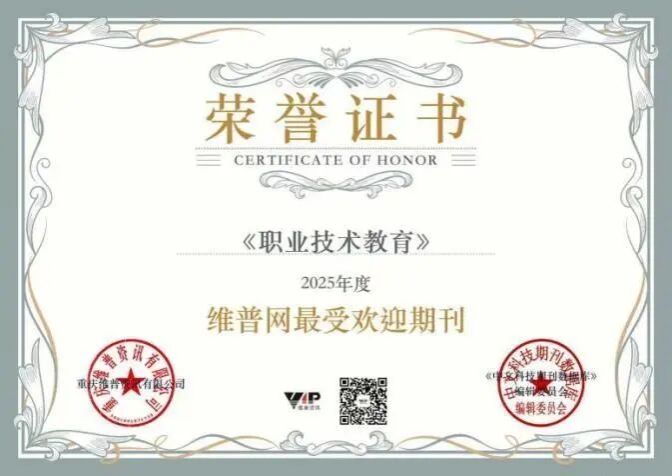近日,重庆维普资讯有限公司和《中文科技期刊数据库》编辑委员会公布了《中文科技期刊数据库》期刊年度影响力报告(2025版)。报告显示,beat365官网《职业技术教育》期刊学术产出质量稳定、核心影响力指标(影响因子、特征因子等)稳居行业前列。基于此,将《职业技术教育》评为“2025年度学术影响力卓越期刊”“2025年度维普网最受欢迎期刊”。
