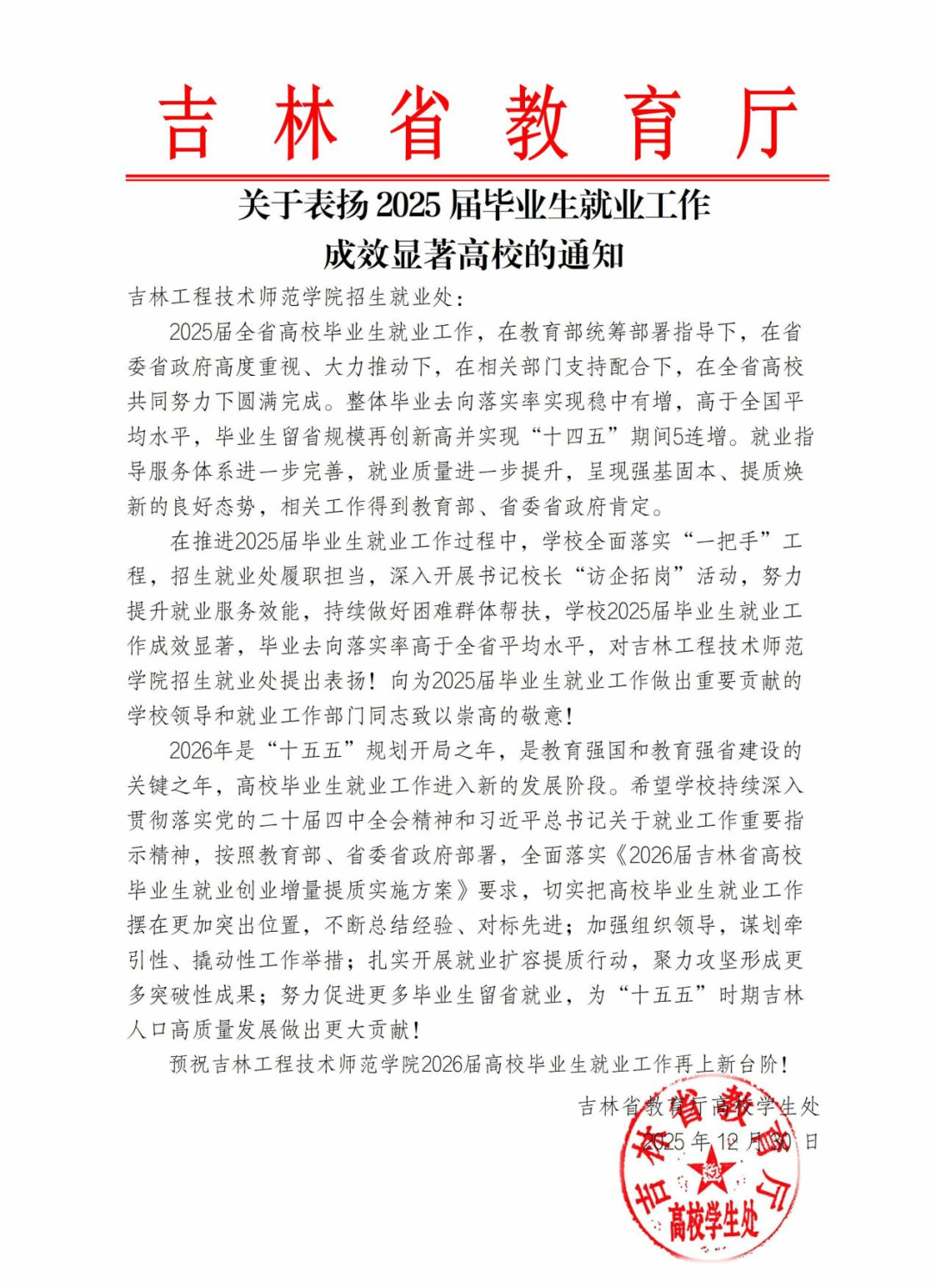 近日,吉林省教育厅向beat365官网发来《关于表扬2025届毕业生就业工作成效显著高校的通知》,对学校2025届毕业生就业工作给予充分肯定和表扬。
