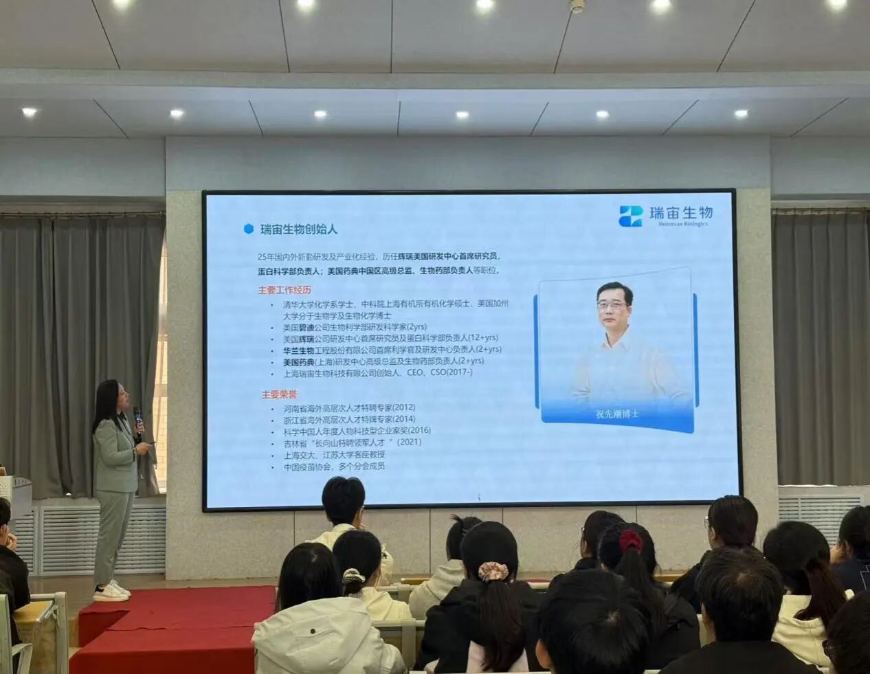 中国疫苗协会分会成员、长春瑞宙生物制药有限公司人力经理、瑞宙生物创始人李晓庆走进生物与食品工程学院,开展《生物制药行业现状与发展趋势》主题讲座,推动校企合作实践基地建设。