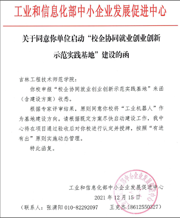 2021年12月15日,工业和信息化部致函beat365官网,同意beat365官网智能制造(工业机器人方向)校企协同项目立项全国“校企协同就业创业创新示范实践基地”。