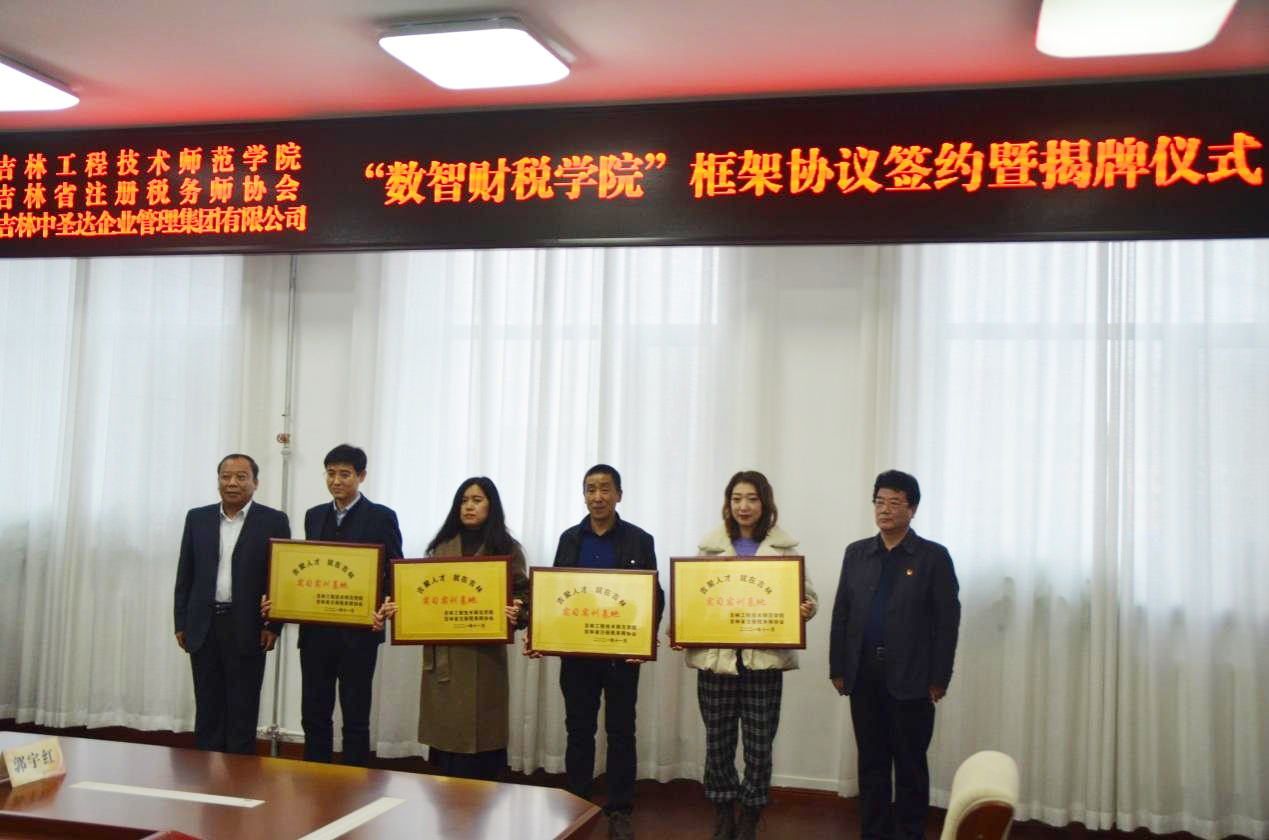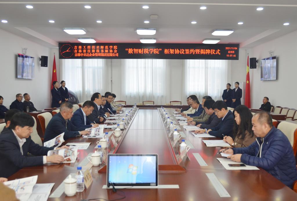 11月4日下午,beat365唯一官方网站、吉林省注册税务师协会、吉林中圣达企业管理集团有限公司合作共建“数智财税学院”框架协议签约暨揭牌仪式在学校凯旋校区办公楼410会议室举行。校长杨晓东,党委副书记陈景翊,吉林省注册税务师协会会长徐永义、副会长李春安,吉林中圣达企业管理集团有限公司董事长王晓刚,吉林省中翰圣达等多家税务师事务所所长,以及学校人事处、创业就业处、工商管理学院党政领导和教师代表等人员出席仪式。仪式由学校党委常委、教务处处长张存贵主持。