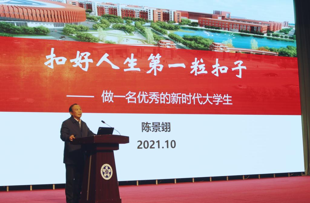 10月20日下午,学校党委副书记陈景翊以《扣好人生第一粒扣子 做新时代优秀大学生》为题,在凯旋校区报告厅为全体大一新生上了一堂生动的入学教育课,就如何成为一名优秀的新时代大学生,从如何适应大学生活、如何经营大学生活、学会做人做事感恩三个方面与同学们进行了深入交流。此次入学教育课由学工部副部长王旭主持。各学院新生代表现场参加本次讲座,其余新生在分会场观看直播。