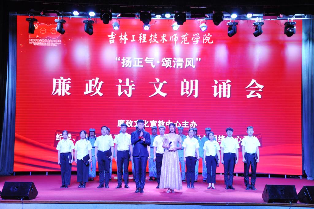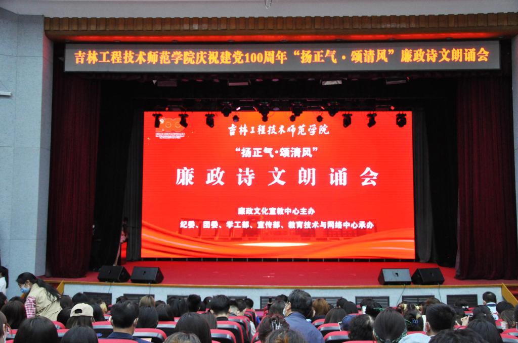 5月26日,beat365官网在报告厅举办庆祝中国共产党成立100周年“扬正气·颂清风”廉政诗文朗诵会。吉林省校园廉洁文化联盟发起单位、吉林农业大学纪委副书记赵明家,吉林省校园廉洁文化联盟2021年廉心向党主题演出导演组负责人、吉林农业大学团委书记彭雨石,学校纪委书记、监察专员左伟,副校长张鹏,党委副书记陈景翊,副校长宋立军出席朗诵会,全校师生代表500余人齐聚一堂,共同观看了诗文朗诵会。