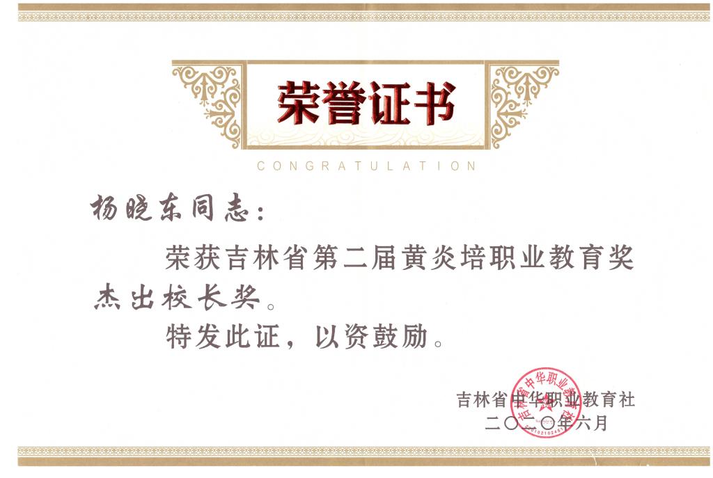 校长杨晓东获吉林省第二届黄炎培职业教育奖杰出校长奖