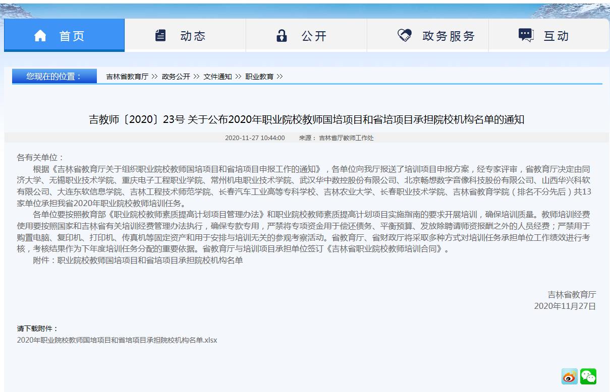 11月27日,吉林省教育厅官网对2020年吉林省职业院校教师素质提高计划国家级培训项目和省级项目的中标单位进行了公示,beat365官网凭借出色的培训实施方案和良好的社会信誉共计中标12项。其中,国培中职项目6项,国培高职项目6项,共计中标金额144.088万元。
