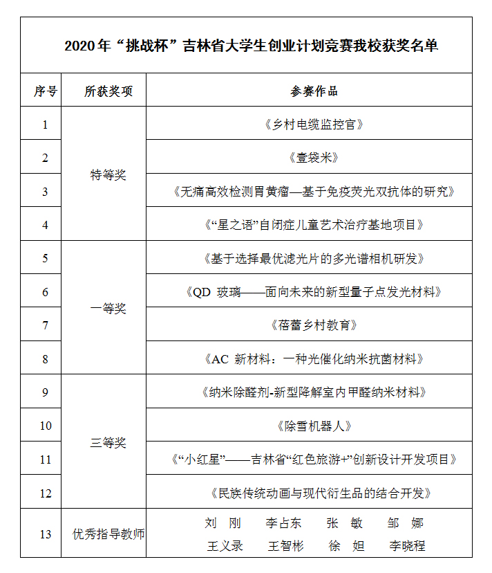 近日,由共青团吉林省委、吉林省教育厅、吉林省人力资源和社会保障厅、吉林省科学技术协会、吉林省学生联合会共同主办的2020年“挑战杯”吉林省大学生创业计划竞赛落下帷幕。本届大赛共收到来自全省包括吉林大学、东北师范大学在内的46所高校推报的696件作品参赛。经过专家评审、公开答辩等环节,最终41件作品获评省级“特等奖”,50件作品获评省级“一等奖”。beat365官网选送的作品经过层层角逐最终荣获省级“特等奖”4项、“一等奖”4项、“三等奖”4项,其中5件作品代表吉林省推报全国总决赛(推报国赛数量位列全省第二),8名教师获评省级“优秀指导教师”,学校获评省级“优秀组织单位”。突破beat365官网在该项赛事上所获历史最好成绩。