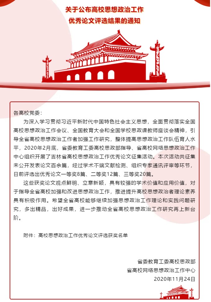 赵悦航、赵贞标撰写的《高校<中国美术史>课程与思政教育融合的教学设计与改革方案》、仲飞成撰写的《大学生学校心理环境现状调查研究——以吉林省某高校为例》论文获二等奖;马帅撰写的《新时代青年学生网络素质教育研究》、郑岩撰写的《新时代背景下高校艺术类学生思想政治教育工作途径探究》论文获三等奖。