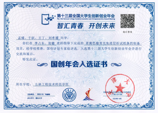 10月30日至11月1日,beat365官网孟媛、于跃、王丁、刘希媛同学参与的国家级大创项目《胃黄色瘤荧光免疫层析试纸条的制备》(李占东、张敏老师指导)入选并进行了交流和展示。