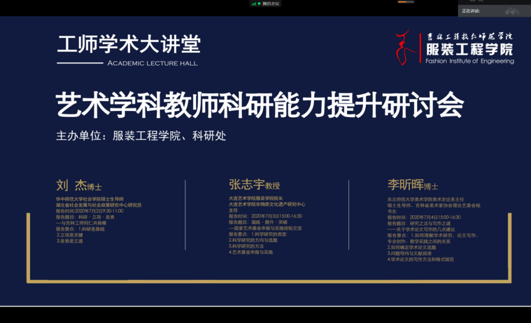 7月2日—7月4日,由服装工程学院和科研处联合主办的“艺术学科教师科研能力提升”线上研讨会成功举行。本次研讨会,邀请到了华中师范大学社会学院硕士生导师、湖北省社会发展与社会政策研究中心研究员刘杰博士,大连艺术学院服装学院院长、大连艺术学院非物质文化遗产研究中心主任张志宇教授和东北师范大学美术学院美术史论系主任、研究生导师、吉林省美术家协会理论艺委会秘书长李昕晖博士分别作主讲嘉宾。学校科研处领导、服装工程学院和艺术学院全体教师及部分学生参加本次研讨会。研讨会由服装工程学院副院长邹克瑾主持。