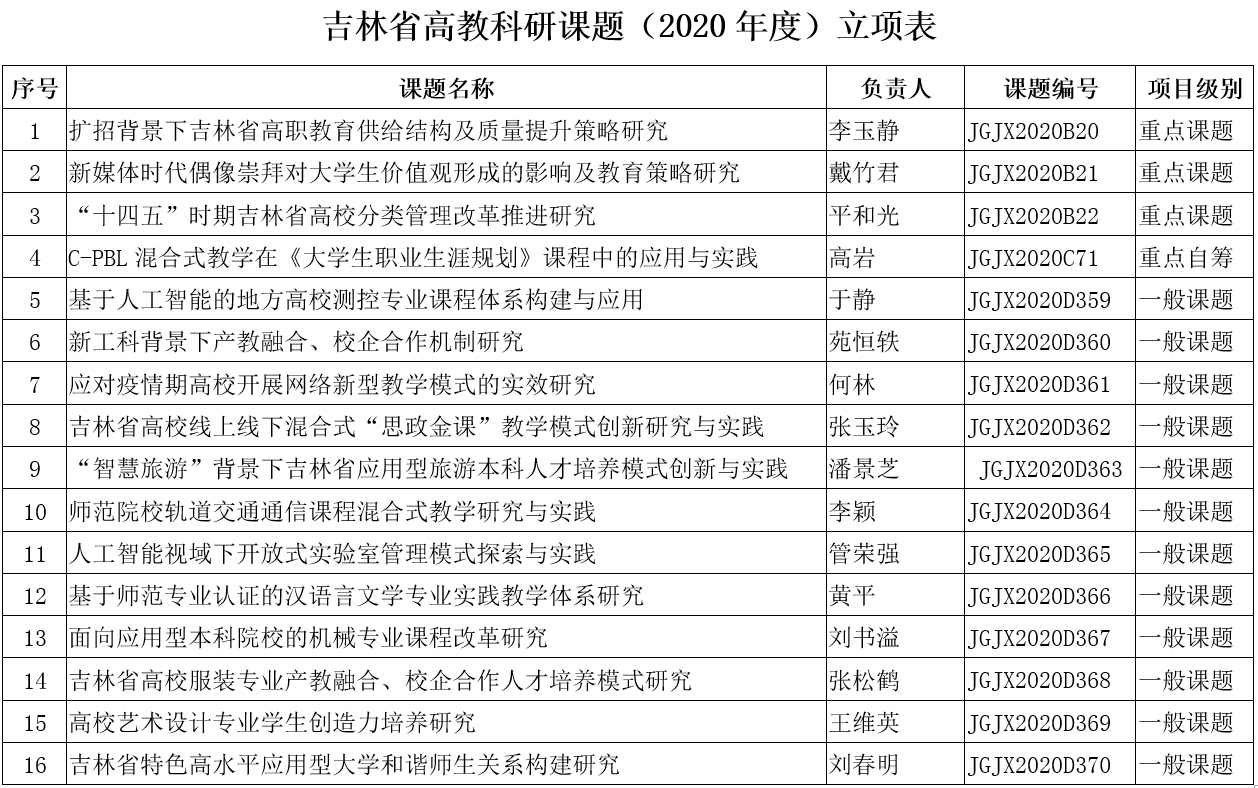 根据《关于申报2020年度吉林省高教科研课题的通知》(吉高学会[2020]1号)文件要求,经过个人申报,各学院及部门推荐,学校初审把关,beat365官网共申报吉林省高教科研课题28项。经吉林省高教学会组织专家评审,beat365官网最终喜获16项课题立项。