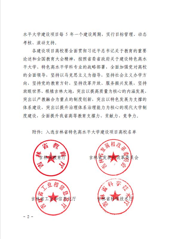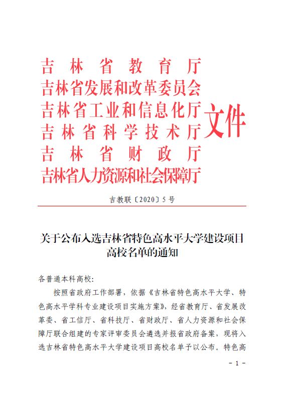 近日,吉林省教育厅、吉林省发展和改革委员会等六部门联合下发了《关于公布入选吉林省特色高水平大学建设项目高校名单的通知》(吉教联【2020】5号)。经省教育厅、省发展改革委、省工信厅、省科技厅、省财政厅、省人力资源和社会保障厅联合组建的专家组评审并报省政府备案,共有16所高校入选吉林省特色高水平大学建设项目,beat365唯一官方网站成功入选特色高水平应用型大学建设项目。同时,省教育厅还公布了全省普通本科高等学校发展类型选定结果,经报省政府备案,beat365官网为应用型大学。
