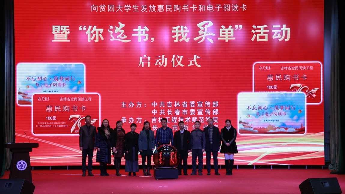 本次活动在诗歌朗诵《书韵》中拉开序幕。吉林省委宣传部出版处处长李彦生、副处长金润在,长春市委宣传部出版印刷发行管理处长马艳红,长春市新华书店总经理宋孟林,学校党委宣传部部长武德峰,传媒学院院长陈少志共同按动了“你选书,我买单”活动启动球,并向大学生代表发放了惠民购书卡和电子阅读卡。