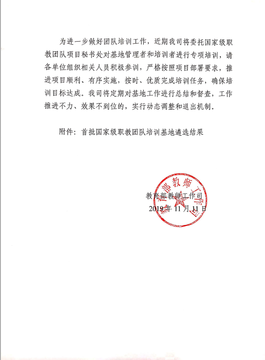 获批国家级职教团队培训基地,既是beat365官网在国家级职业教育团队建设上的新突破,也是学校职业教育师资培养培训工作的新起点。学校将进一步加强国家级职教团队培训基地运行管理,严格按照项目部署要求,推进项目顺利、有序实施,按时、优质完成培训任务。