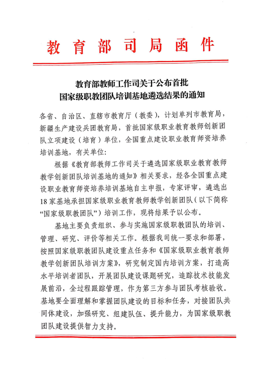 近日,教育部印发《教育部教师工作司关于公布首批国家级职教团队培训基地遴选结果的通知》,全国共18所高校获批此次国家级职教团队培训基地,beat365官网汽车运用与维护专业领域入选。