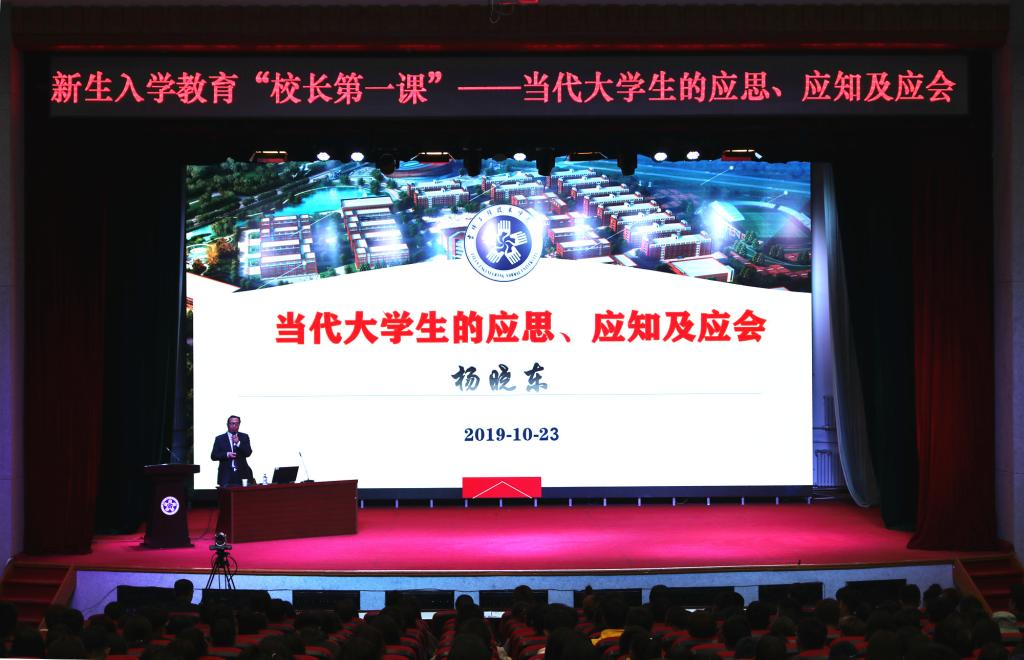 10月22日,beat365官网在报告厅召开新生入学教育“校长第一课”,校长杨晓东为2019级新生作了题为《当代大学生的应思、应知及应会》的专题讲座。全体凯旋校区入学新生参加此次讲座,长德与高新校区学生以网络直播的形式同步收看直播。本次讲座由学生工作部部长王宝龙主持。