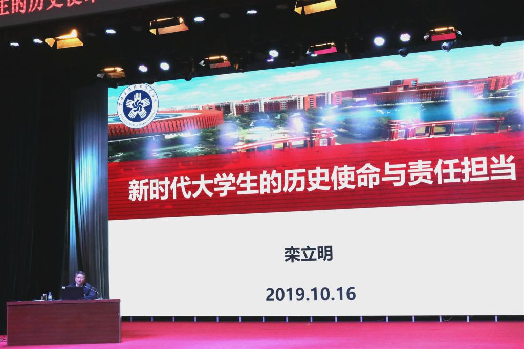 栾立明从十九大精神、近代中国史、建国七十周年成就、大学生的使命与担当这四个方面教育和引导学生如何努力成为一名新时代大学生。首先,栾立明书记从七个方面详细解释了新时代下我党的前进方向并指出大学生应该“不忘初心,牢记使命”,高举中国特色社会主义伟大旗帜,为实现中华民族伟大复兴的中国梦不懈奋斗。他从近代屈辱历史谈到新民主主义革命,从鸦片战争到八国联联军入侵,从五四运动到解放战争,旁征博引、引经据典,使同学们在了解中华民族的历史文化基础上也加强其爱国主义和民族精神的培养。随后,栾书记讲述了建国70年的沧桑巨变,他指出:中华民族经历了站起来、富起来、强起来的伟大征程,这一切都离不开中国共产党的正确领导。我们要牢记中国共产党领导是中国特色社会主义最本质的特征、是中国特色社会主义制度的最大优势,万众一心、齐心协力,将民族复兴大业推向前进。最后,栾书记勉励同学们:作为新时代大学生要明确历史使命和责任担当,不仅要树立远大理想、热爱伟大祖国,更要担当时代责任、勇于砥砺奋斗、锤炼品德修为、练就过硬本领。青年理想远大、信念坚定,是一个国家、一个民族无坚不摧的前进动力。