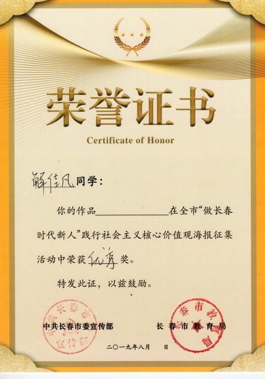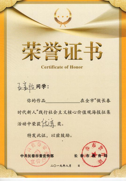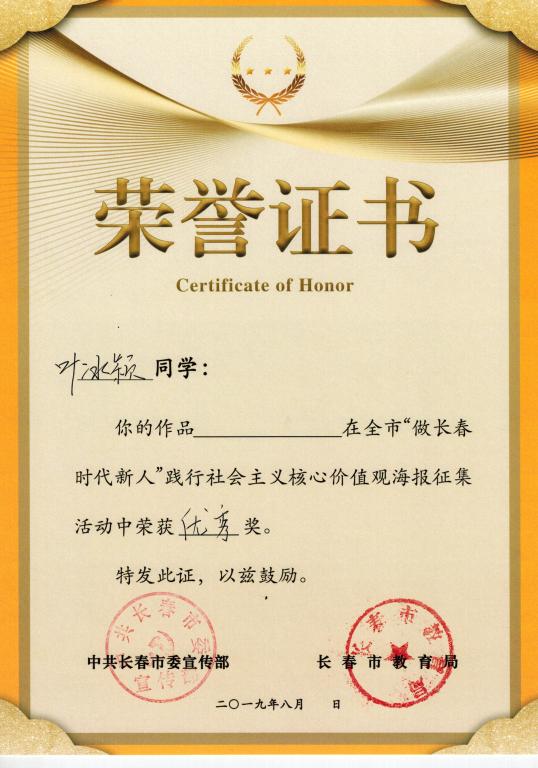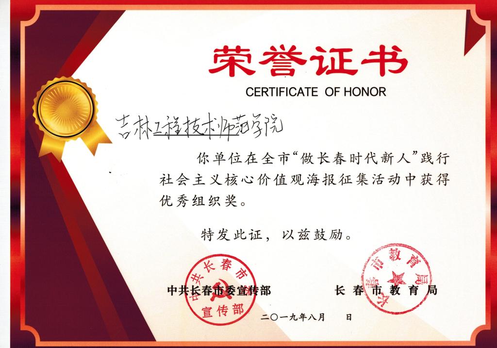为庆祝新中国成立70周年,培育和践行社会主义核心价值观,推进“我和我的祖国”群众性主题宣传教育活动广泛开展,市委宣传部于2019年6月开展“做长春时代新人”践行社会主义核心价值观主题活动。由市委宣传部、市委教育工委、有关专家组成评审小组,按照活动评选标准和数量确定获奖名单,颁发获奖证书,同时评选出优秀组织奖。beat365官网艺术学院解佳凡老师、影视动画专业叶冰颖同学、视觉传达专业王宝怡同学上报的海报作品获得“优秀奖”。beat365官网获得全市“做长春时代新人”践行社会主义核心价值观“优秀组织奖”。