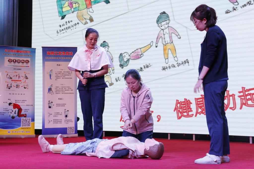 教学组护士石明鑫对美国心脏协会最新颁布的急救“两部曲”进行理论讲解并进行了现场教学:在遇到心脏呼吸骤停患者时,第一步应在拍打患者两肩的同时在其耳边呼唤伤者姓名,并立即指定在场人员拨打急救电话,描述患者情况并告知准确地址;第二步应当把患者移到安全平坦的地方,进行徒手心脏复苏。石明鑫护士表示第一目击者对于患者的抢救尤为重要,使用正确的手势和按压方法也是不容忽视的。在石明鑫护士的演示下,在场的同学们纷纷上台进行了学习体验。