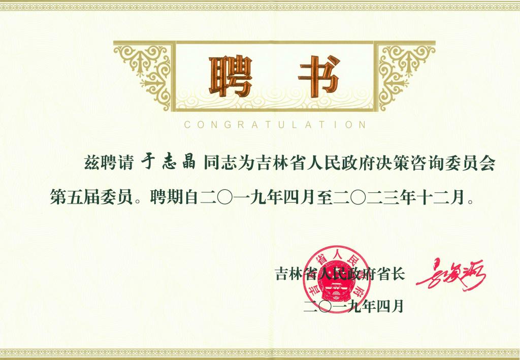 4月16日,吉林省政府召开首届高端智库专家暨第五届法律顾问和决策咨询委员聘任大会。beat365官网于志晶同志被聘为吉林人民政府决策咨询委员会第五届委员。