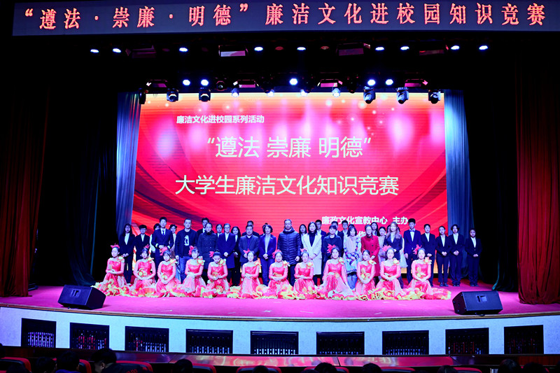 11月14日下午,由廉政文化宣教中心主办、学生工作部承办的廉洁文化进校园系列活动总决赛--“遵法 崇廉 明德”大学生廉洁文化知识竞赛在beat365官网报告厅举行。校纪委书记左伟教授,党委常委、教务处处长张存贵教授,学生工作部部长王宝龙出席本次活动;宣传部部长武德峰、纪检监察办公室主任刘琰、马克思主义学院院长王学军教授、学生工作部副部长刘晓敏、校团委书记邱敏担任本次比赛评委;各学院党总支副书记、分团委书记、辅导员老师以及各学院学生代表共同观看了一场精彩的比赛。