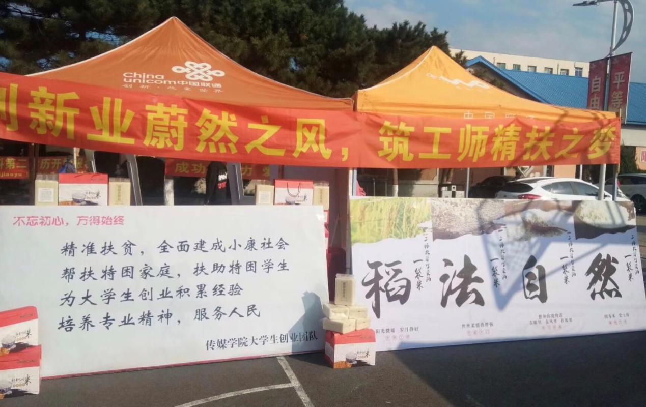10月6日,在学校迎接新生的现场,传媒学院大学生创新创业团队开展“壹袋米”双向扶贫活动。
