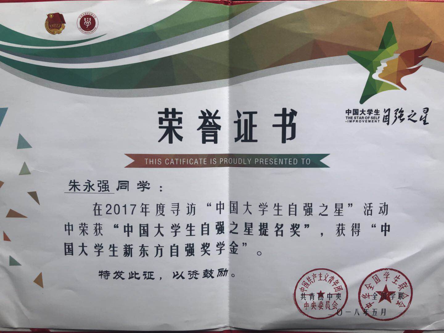 朱永强,男,机械工程学院2015级学生,校十佳大学生,2017年长春市优秀大学生获得者。他学习刻苦,多次获得校级奖学金和国家励志奖学金;他热衷实践,积极参加科技竞赛,多次代表学校参加各级各类学科竞赛并荣获多项荣誉。获得科技创新奖项共计18项,3DDS等国家级奖项2项,挑战杯、第三届吉林省互联网+大学生创新创业大赛等省级奖项7项,校级奖项9项,学院奖项若干。
