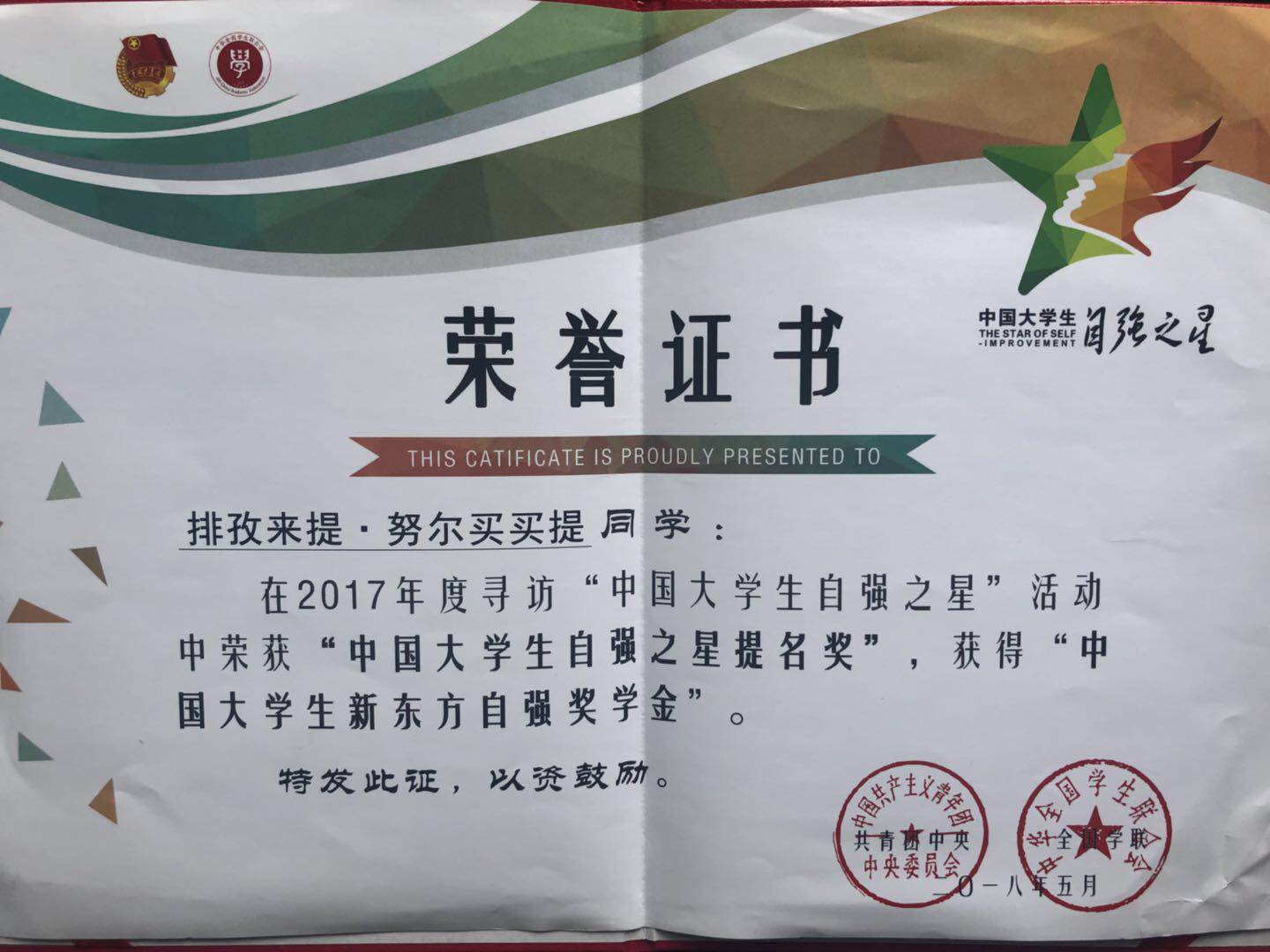 近日,由共青团中央、全国学联共同主办的2017年度寻访“中国大学生自强之星”活动评选结果揭晓,beat365官网机械工程学院朱永强、汽车工程学院排孜来提·努尔买买提两名同学荣获“中国大学生自强之星”提名奖,每人获得由新东方教育科技集团提供的“中国大学生新东方自强奖学金”2000元。