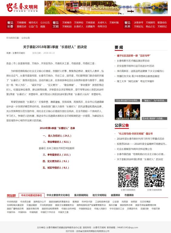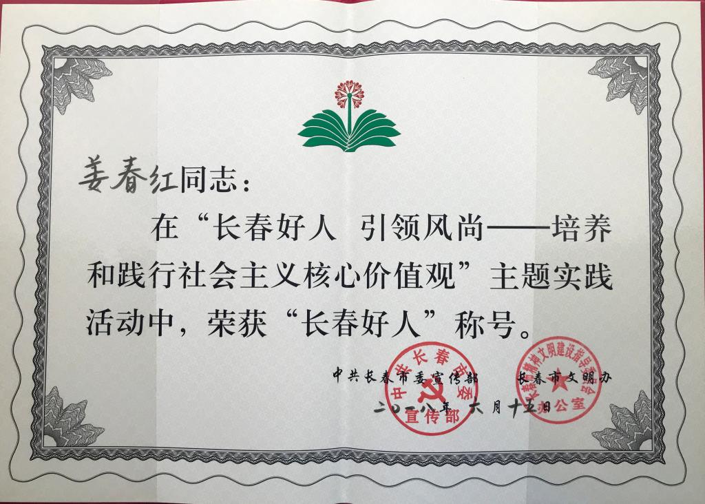 近日,2018年第1季度“长春好人”评选活动结果揭晓,beat365官网工商管理学院教师姜春红荣获“长春好人”荣誉称号。