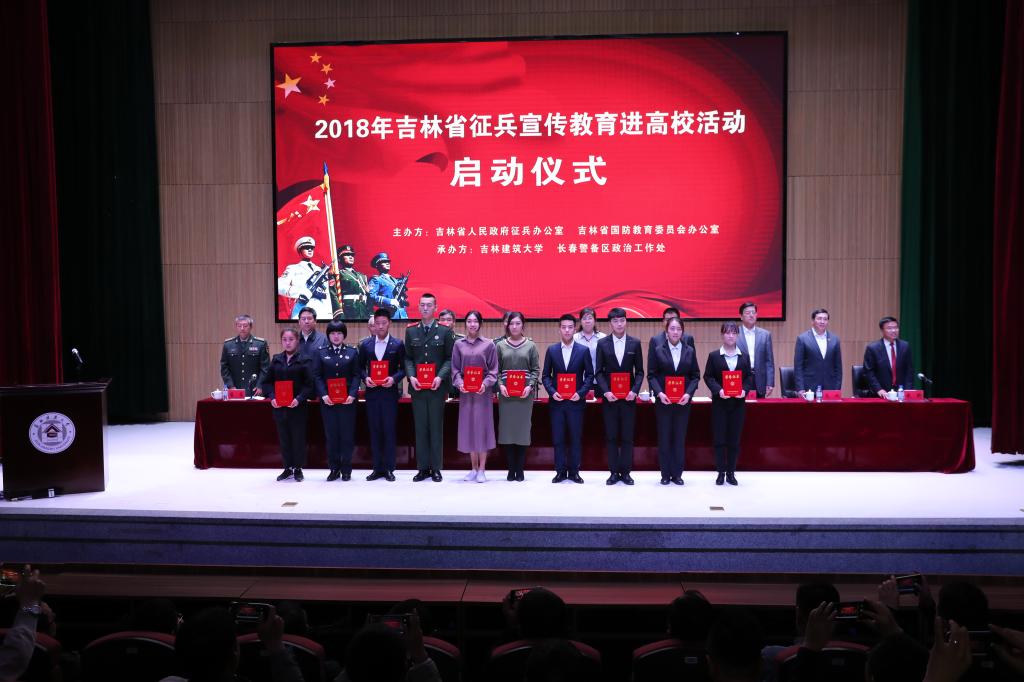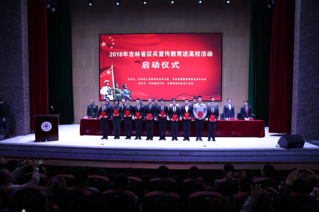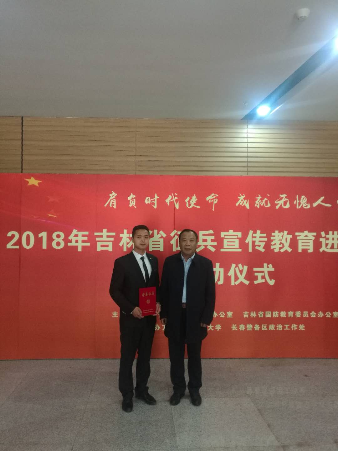 4月20日,由吉林省人民政府征兵办公室、吉林省教育厅、共青团吉林省委和吉林省国防教育委员会办公室主办的2018年吉林省征兵宣传教育进高校活动启动仪式暨吉林省“优秀大学生士兵”表彰大会在吉林建筑大学图书馆报告厅举行。启动仪式上,beat365官网食品工程学院叶长泽同学获得“大学生士兵标兵”荣誉称号并受到表彰,电气工程学院杨鑫淼同学获得“优秀大学生士兵”荣誉称号。