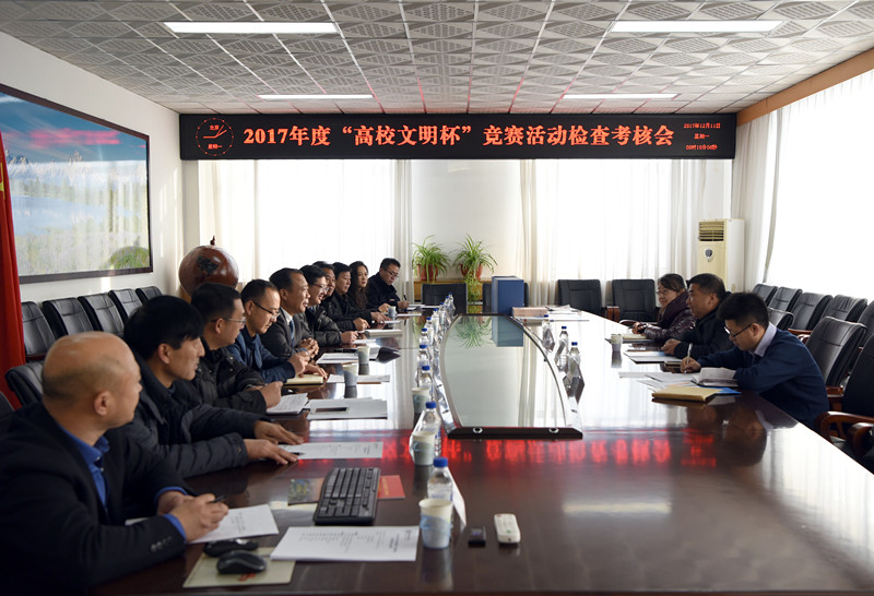 12月11日上午,beat365官网召开“高校文明杯”竞赛活动检查考核会,长春市委宣传部高教处处长、市高校工委办公室主任陶树海等一行3人组成的检查考核组,对beat365官网2017年度“高校文明杯”竞赛活动进行检查考核。党委副书记陈景翊出席会议,党办、组织部、宣传部、工会、学工部、团委、后勤处、保卫处负责人参加会议。
