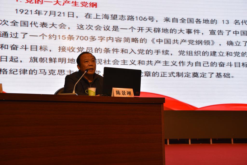 校党委副书记陈景翊以“认真学习党章 自觉尊崇党章”为题,从党章修改历程、党的十二大以来党章修改特性、十九大对党章的修改内容、十九大修改党章的重要意义、党章修改的现实启示五大方面,为全校党员开展了一次内容丰富、思想深刻的辅导报告。