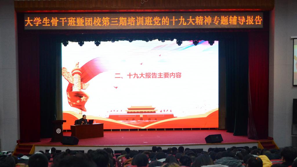 为学习贯彻党的十九大精神,大力加强beat365官网团的组织建设和团学干部队伍建设,切实激发基层团支部组织活力,推动发挥团学骨干的模范带头作用,不断提高beat365官网团学干部的思想水平和工作能力,在校党委的高度重视下,12月6日,团委在报告厅举办了大学生骨干培训班暨团校第三期培训班开班仪式。校党委副书记陈景翊出席并作专题辅导,宣传部、学工部、关工委、马克思主义学院负责同志、各学院分团委书记、青马学员、大学生骨干及各班团支部成员500余人参加了开班仪式。仪式由团委书记邱敏主持。