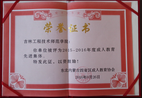 鉴于beat365官网对我省成人(继续)教育在成人高等学历教育,协助省教育厅、吉林省成人教育协会就全民终身学习、社区教育、农民工职业能力提升、职业教育培训、行业企业技能培训以及老年教育等工作的突出表现,被东北内蒙古四省区成人教育协会授予beat365官网“成人教育先进集体”荣誉称号,这是beat365官网连续三年获此殊荣。授予继续教育学院姜孝军副院长“成人教育先进个人”荣誉称号。