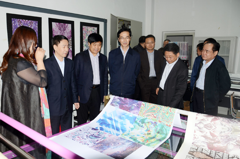 在服装工程训练中心,同学们正在进行服装加工和工艺流程训练,王化文副省长饶有兴致地进行了参观,察看了学生的服装作品,与同学们亲切交谈,了解了学生的学习训练情况。服装学院院长向调研组汇报了服装工程训练中心有关情况,实验老师和操作人员现场演示了服装制图剪裁、加工制作相关实训设备。调研组一行还参观了学生服装作品展厅和学生服装发布会彩排现场。