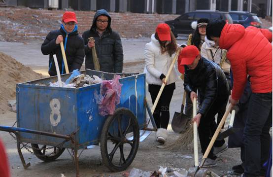 永盛社区内有一条还没有建好的街道,即不属于环卫又不属于附近小区的物业,所以经常有大量的生活垃圾被道在这里。经过一冬天的冰雪已经都被冻在了一起,很难清理。同学们用镐头和铁锹一下一下地清理混合在冰里的垃圾,室外温度很低风又大,冰冷的寒风没有阻挡住同学们的爱心行动,大家干的非常有劲儿!