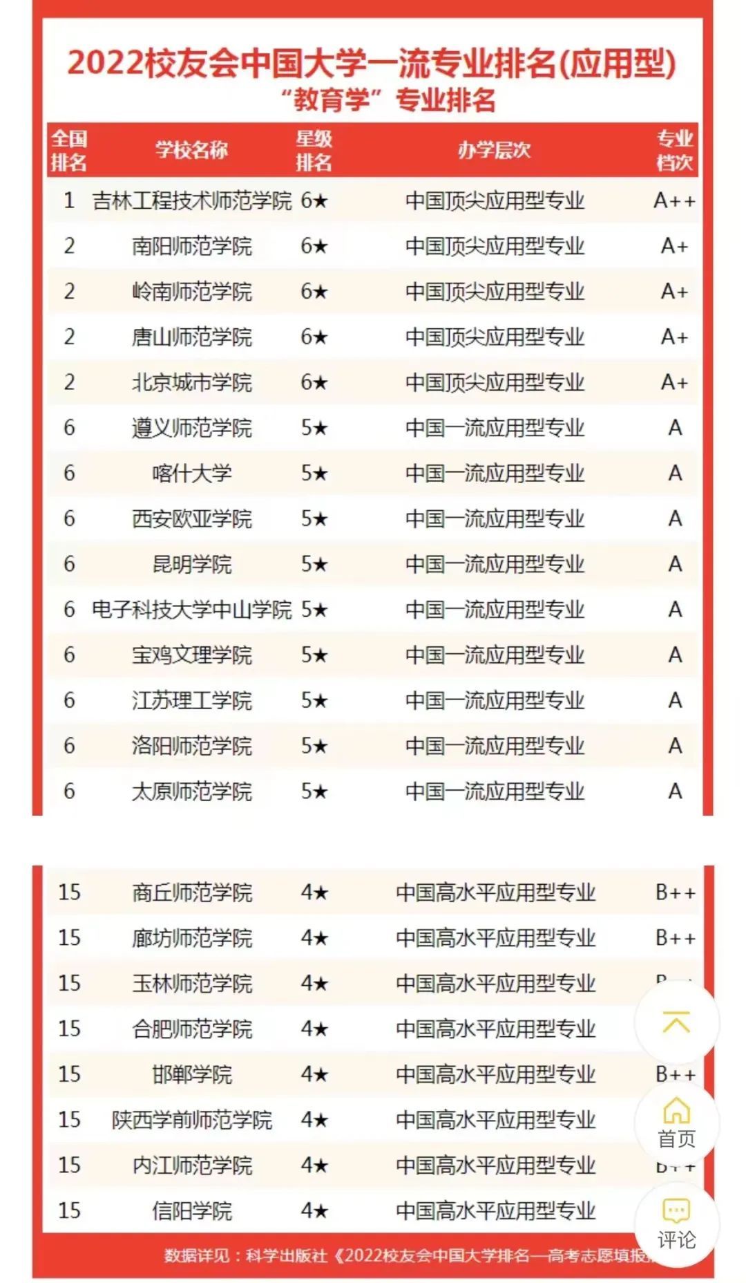 在榜单公布的校友会2022中国大学教育学专业排名(研究型)中,北京师范大学、华中师范大学荣获2022中国七星级专业,跻身世界知名高水平专业、中国顶尖专业行列;西南大学、湖南师范大学、河南大学、山东师范大学获六星级专业,晋升世界高水平专业、中国顶尖专业行列。安徽师范大学、天津大学、华南师范大学、陕西师范大学、中南民族大学、东北师范大学、西北师范大学、福建师范大学、河南师范大学、河北大学、曲阜师范大学获五星级专业,进入世界知名专业、中国一流专业行列。