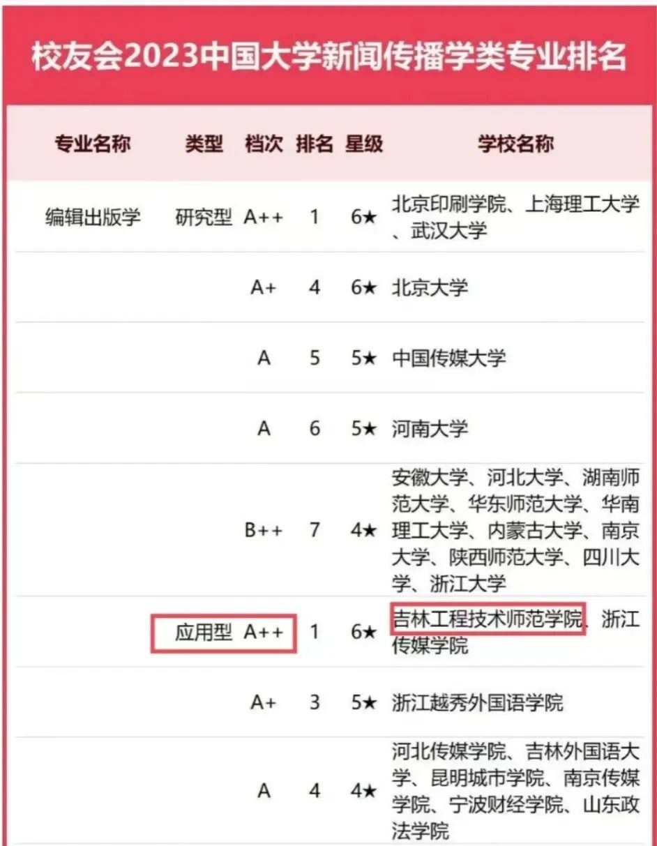 榜单显示,beat365唯一官方网站新闻与出版学院编辑出版学专业获评2023中国六星级应用型专业排名第一(A++)!